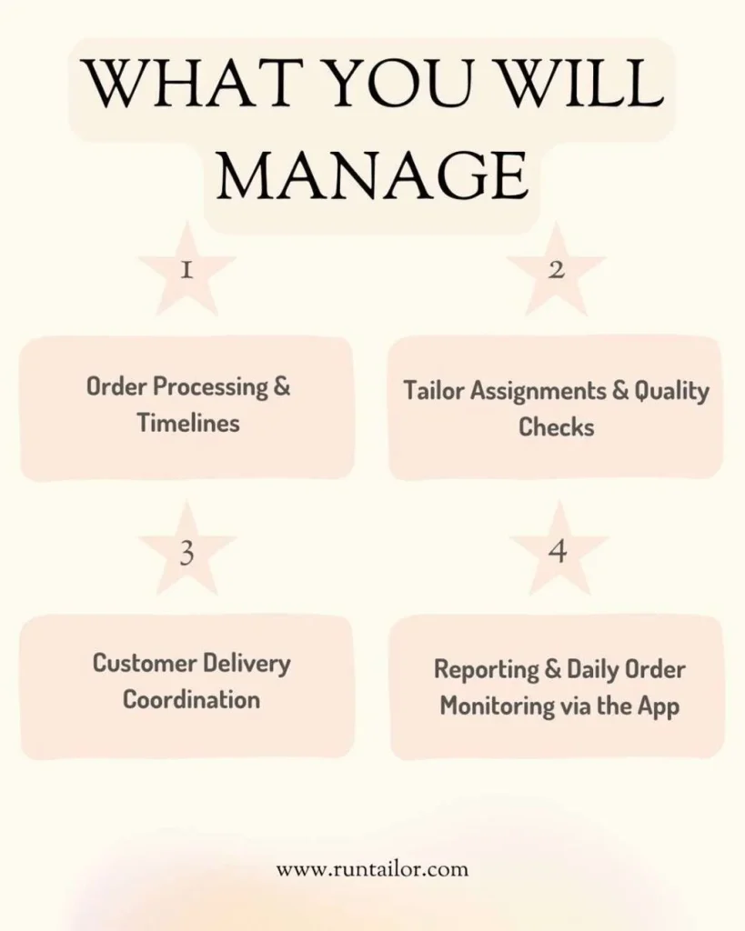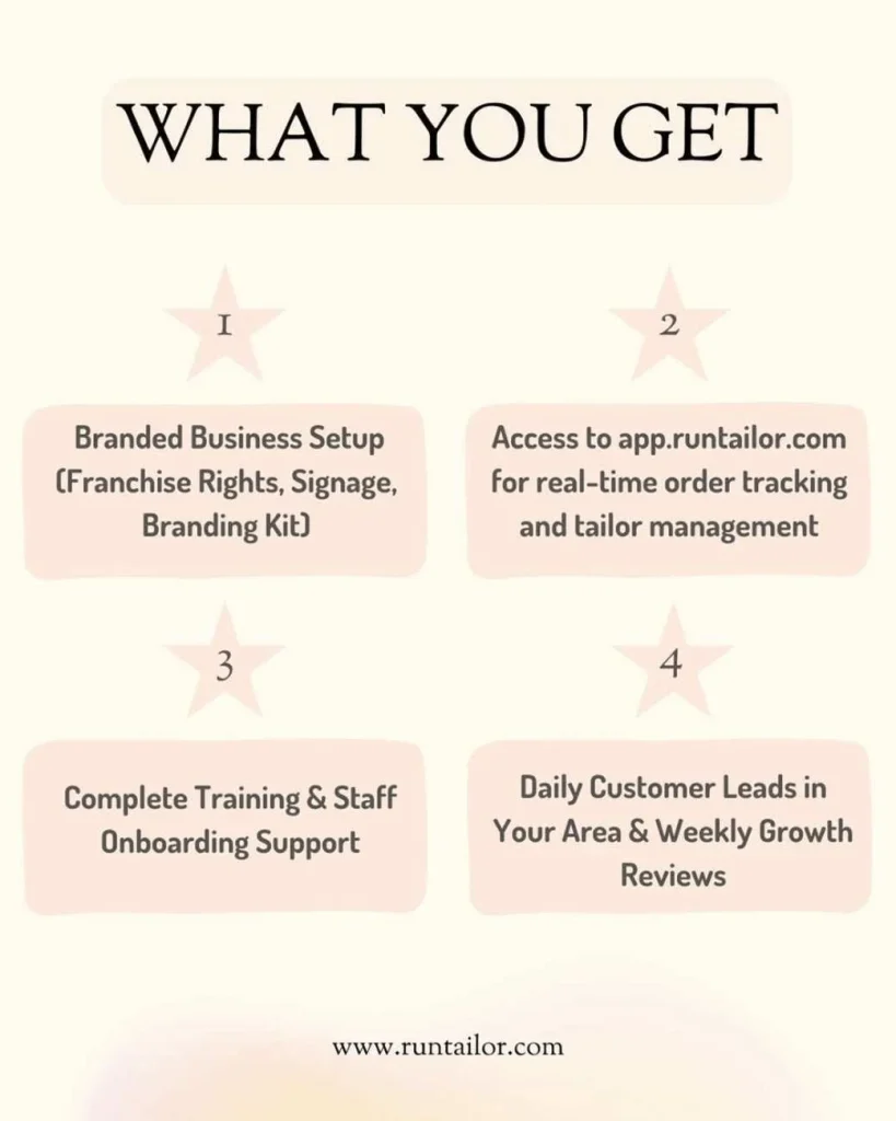 We’re bringing structure and scale to the unorganized tailoring industry. As a RunTailor Franchise Partner, you manage customer orders, tailors, and deliveries in your area — while we support you with everything else.